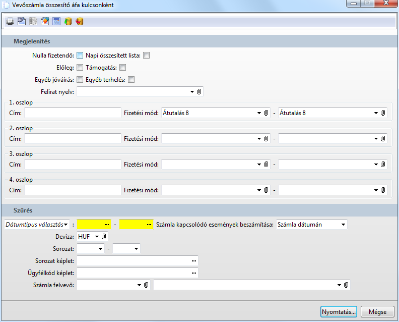 Funkció elérése menüszerkesztéskor: Vevőanalitika / Szállítóanalitika / Számlaösszesítő áfa kulcsonként