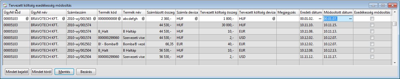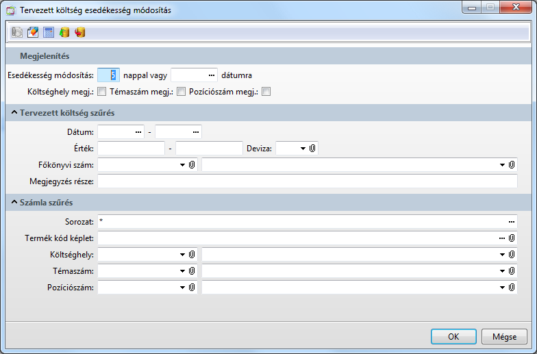 Funkció elérése menüszerkesztéskor: Vevőanalitika / Szállítóanalitika / Tervezett költség esedékesség módosítás
