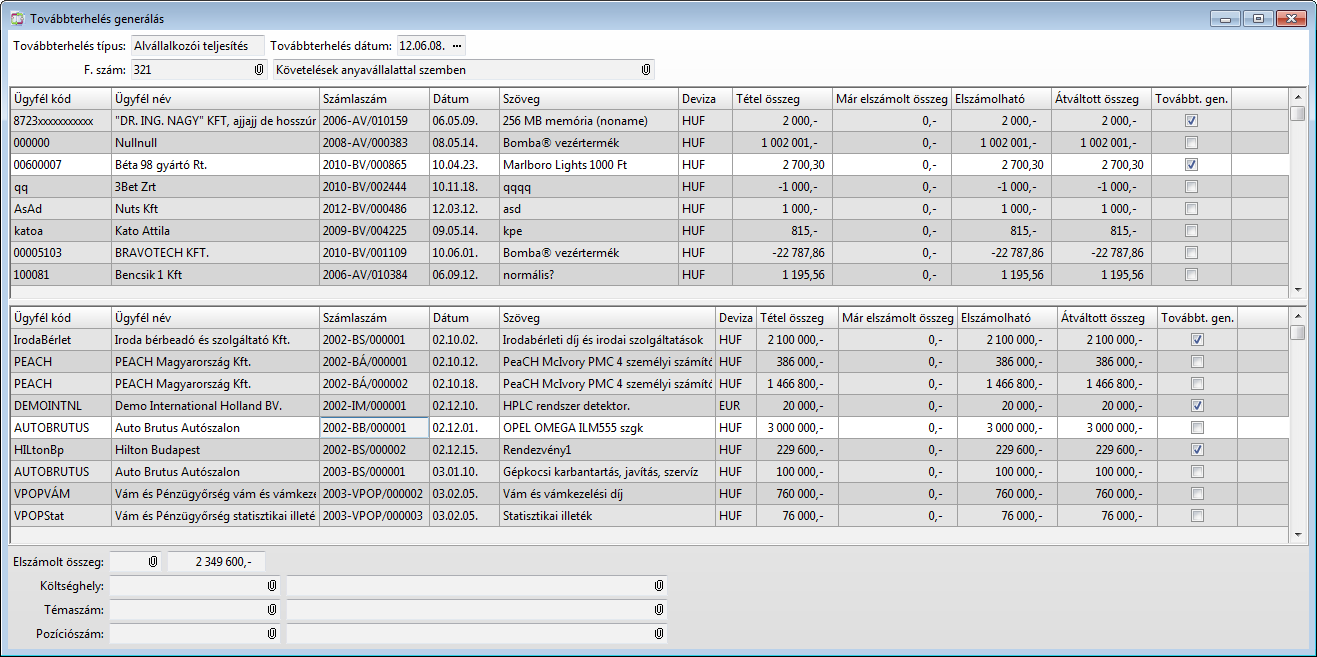 A funkció indításakor megjelenő párbeszédablakon adhatjuk meg a számlák szűrését. A jóváhagyás után megjelenő ablakban a szűrésnek megfelelő vevő- és szállítószámlák szerepelnek. A felső ablakban lépkedve az alsó ablakban mindig azok a számlák látszanak amelyekhez továbbterhelést generálhatunk. Az alsó ablakban tudjuk bejelölni, hogy mely számla tételeket szeretnénk továbbterheléssel a felül aktív számla tételekhez kötni. A továbbterhelendő összeget mindkét helyen módosíthatjuk. (Árbevétel és Rezsi típusnál az eredményablakban csak a megfelelő analitika számlái látszanak.)