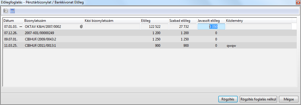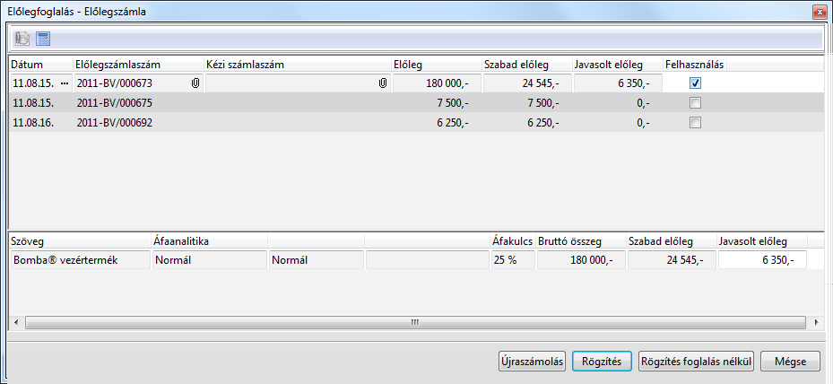 Az első táblázatban az előleg illetve az előleg engedményezéssel típusú bank-, illetve pénztár tételek jelennek meg. Oszlopok: dátum (az előleg típusú bizonylat rögzítésének dátuma), bizonylatszám (az előleg típusú bizonylat száma), kézi bizonylatszám (csak pénztárnál), a befizetett előleg teljes összege, a még le nem foglalt szabad előleg, javasolt előleg (módosítható). A javasolt előlegek összegének meg kell egyeznie a számla összegével, de maximum a szabad előlegek összege lehet. A szabad előlegeket időrendben kell felhasználni. Előlegfoglaláskor a megfelelő bank- és pénztár típusú bizonylatoknál a "Számlák" táblázatban megjelenik a mentett számla száma, az átvezetett összeg és a számla teljesítés dátuma (az előleg típusú tétel számlák táblázatában az átvezetés dátuma mezőben látható). A táblázat oszlopai: |