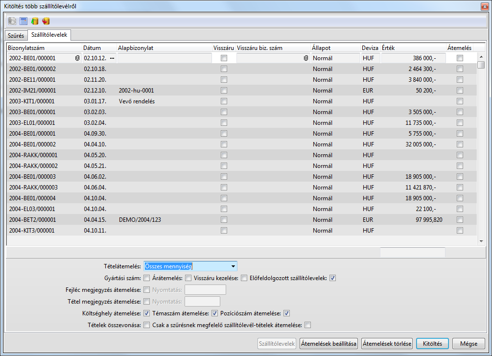 Csak a szűrésnek megfelelő szállítólevél-tételek átemelése |