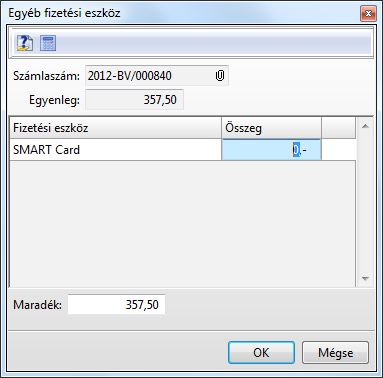 A számla mentésekor megjelenő párbeszédablakban a kezelő megadhatja, hogy mely egyéb fizetési eszközzel, milyen értékben történik a számla bruttó értékének a kiegyenlítése.