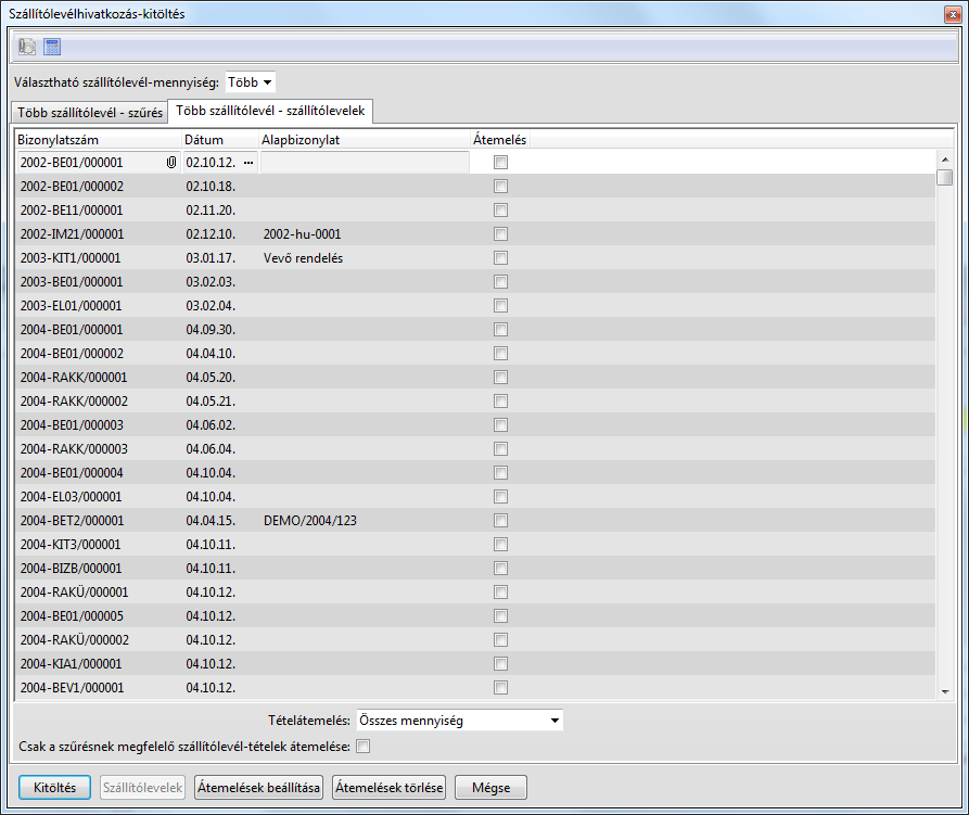 Az összes szállítólevélnél beállítja az Átemelés pipát (kijelöli azokat összekapcsolandóként). |
