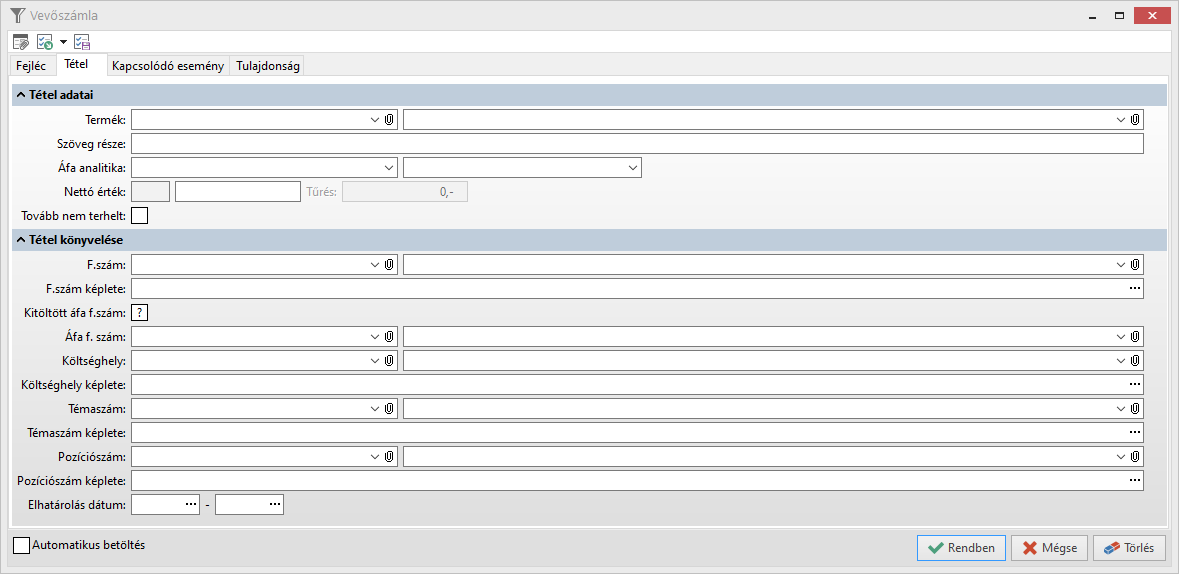 Deviza / Összeg / Tűrés Szűrés a devizanemre, számla végösszegére, a megadott végösszeghez viszonyított tűrésre. (A deviza mező megegyezik a Fejléc fülön megadottal, a tűrés mező csak az összeg megadása után válik aktívvá.) |