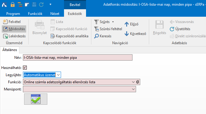 •Készítsünk egy adatforrást amelybe a funkció: Online számla adatszolgáltatás ellenőrzés lista (legyűjtés Automatikus üzenet ajánlott)
