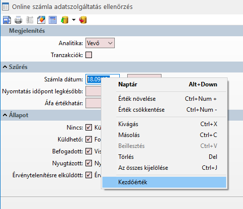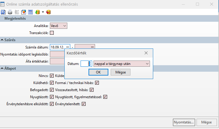 •Amikor a listát paraméterezzük, akkor számla dátumnak adjunk kezdőértéket 0 - nappal a tárgynap után, hogy adott nap csak az aznapi számla dátumú számlák kerüljenek a listába.