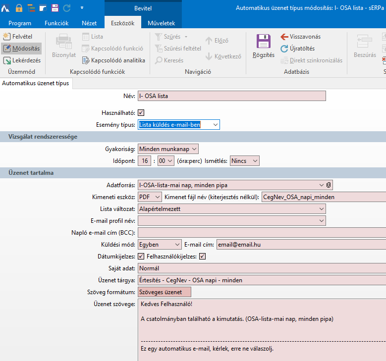 •Vegyünk fel egy AUT, amelynek a típusa: Lista küldés e-mail-ben.