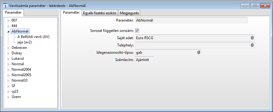 Pipa esetén nem sorozatonként lesz sorfolytonos a sorszámkiosztás, hanem mindegyik paraméter alá felvett minden sorozatra együttesen nézve lesz sorfolytonos. Az alábbi paraméterbeállítás miatt a mező csak látszik, de nem módosítható a sERPa menüben, vagy a sERPa menüből másolt felhasználói menüben: Mező-engedélyezés Nem írható StaticText7,SorozatFuggetlenSorszam. A bepipálás előtt kérje tanácsadója segítségét, annak az eldöntésében, hogy az Ön ügymenete mellett értelmezhető-e a bepipált állása a paraméternek! Például automatikus számlagenerálás használata esetén tilos a paraméter beállítása! Akkor tudja bepipálni a mezőt, ha a felhasználói menüben törli a jelzett menüparamétert. |
