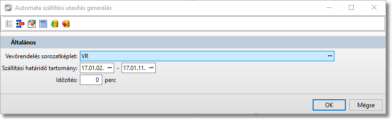 Az Automata szállítási utasítás generálás párbeszédablakán vevőrendelés sorozatképletet és szállítási határidő tartományt adhatunk meg, valamint módosíthatjuk a futási időzítést (ekkor ez visszaírásra kerül a Paraméterbe).