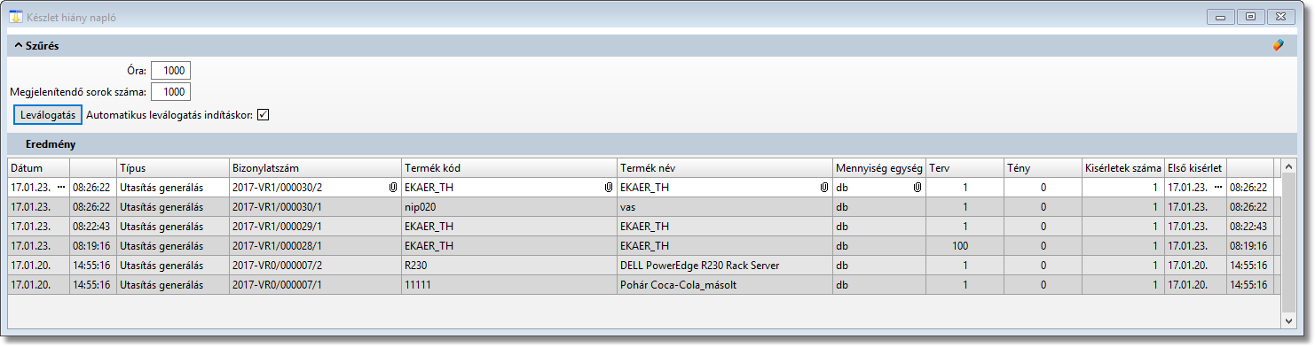 Segítségével a Szállítási utasítás generálás és az Automata szállítási utasítás generálás funkciók futtatása, az utasítások generálása, illetve a WBS rendszer által történő utasítás feldolgozás kapcsán keletkezett, készlet hiányra visszavezethető eseményeket kérdezhetjük le. Azt is láthatjuk, hogy egy meghiusult utasítás generálással mióta próbálkozik a program és hányadik alkalommal volt sikertelen. A funkcióba lépve a fejlécben megadhatjuk, hogy az elmúlt hány óra eseményeit, illetve maximum mennyi tételsort jelenítsen meg az eredménytáblázat. Szabályozhatjuk, hogy a funkció indításakor az eredménysorok azonnal betöltődjenek vagy sem.