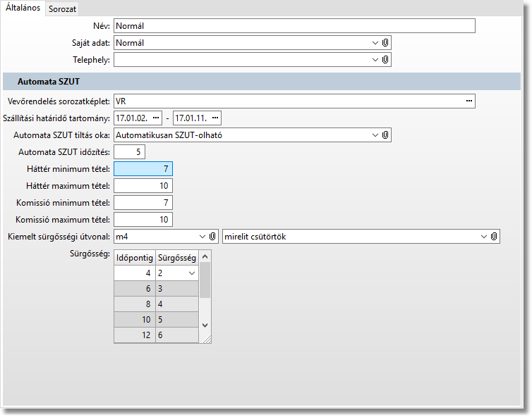 A Sorozat fülön az Automata SZUT pipa, ami az adott szállítási utasítás sorozat és az új funkció, az Automata szállítási utasítás generálás kapcsolatát szabályozza.