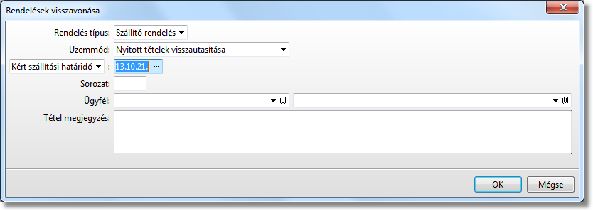 Azok a Szállító rendelések, melyek adott teljesítési dátumra nem érkeztek be, tételei nyitottak, azok Rendszerfunkciók \ Adatbázis karbantartás \ Rendelések visszavonása funkcióval visszautasíthatók, ez automatizmusként is beállítható.