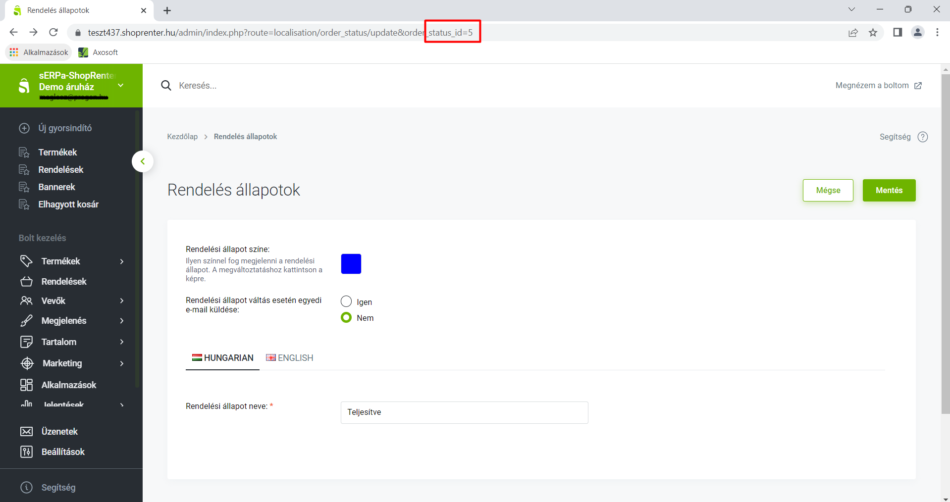 A webshopban leadott rendelések állapotának megváltozása sERPa oldalon.