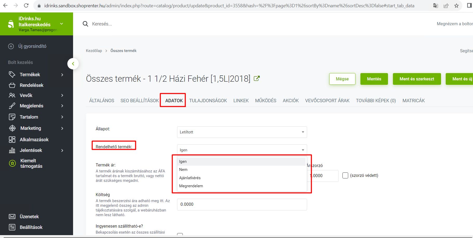 Első lépésként használhatóra állítjuk a Webáruház paramétert (ne módosítsunk semmit, ami kikerülne a webáruházba,)