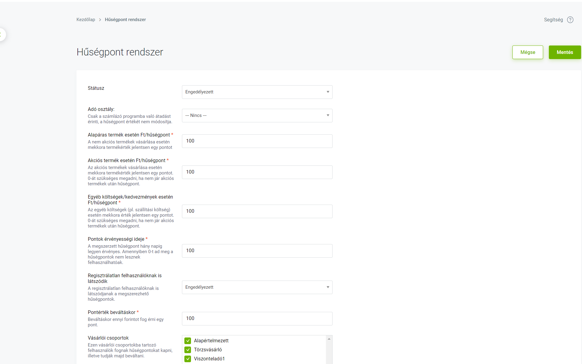A paraméterek a Webáruház paraméter funkcióban adhatók meg, pl. termékek köre, használt ártábla, raktár, vevőrendelés sorozat, amelyre jönnek a vevőrendelések. (ShopRenter típust kell választani)