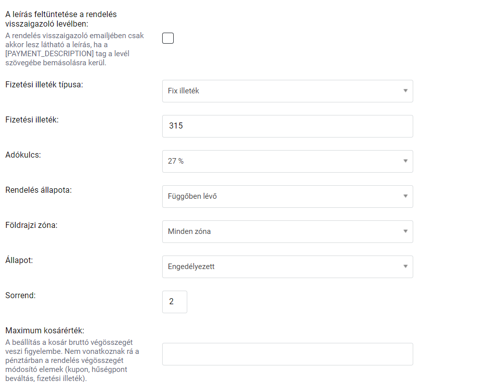 1. A ShopRenter admin oldalán, a Beállítások/Rendelési beállítások/Fizetési módok részen tudjuk beállítani az utánvétel díját, a Fizetési illeték és az Adókulcs mezők töltésével.