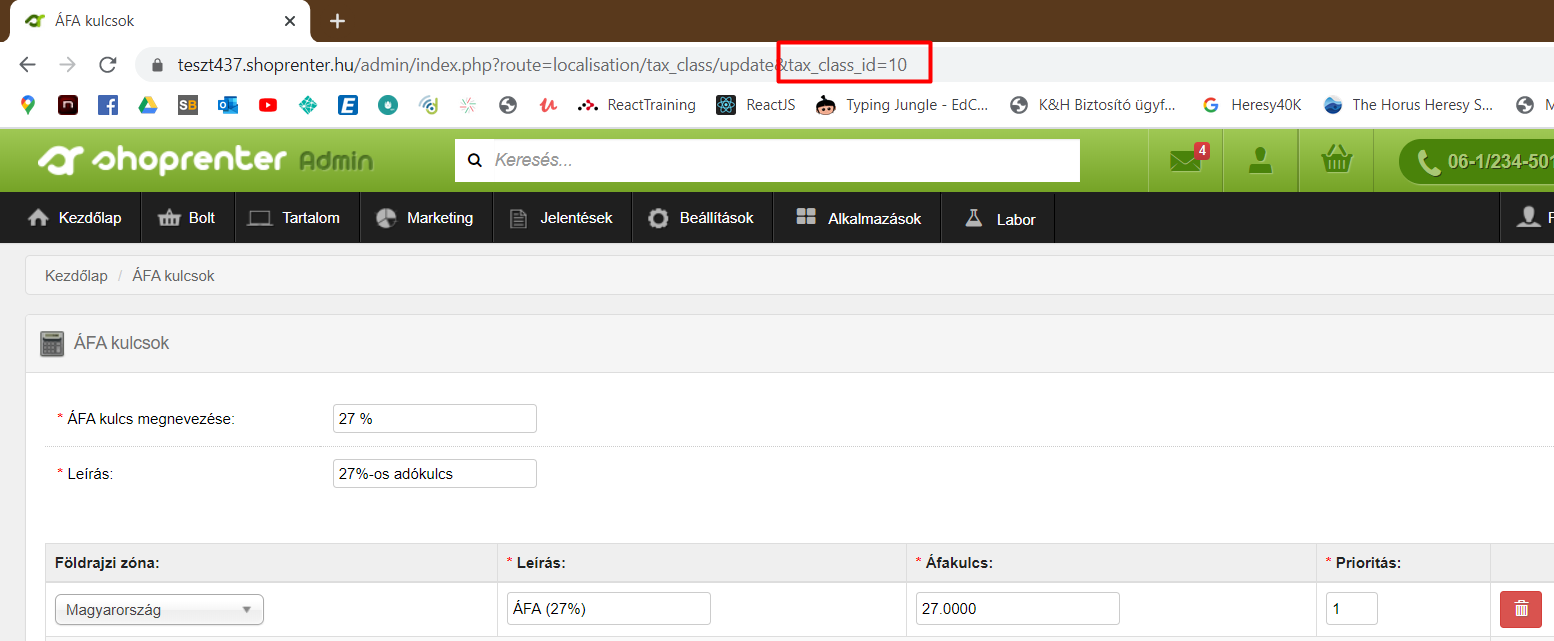 Az itt felvett vagy alapból megkapott kulcsoknak meg kell nézni, szerkesztés gombbal tax_class_id-t (tipikusan: 0 áfa esetén 11; 27 áfa esetén 10 - pirossal bekeretezett mezőben látható)