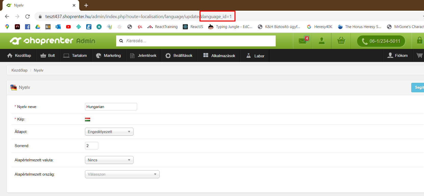 Az itt felvett vagy alapból megkapott kulcsoknak meg kell nézni, szerkesztés gombbal language_id-t (tipikusan: magyar esetén 1; angol esetén 3 - pirossal bekeretezett mezőben látható)