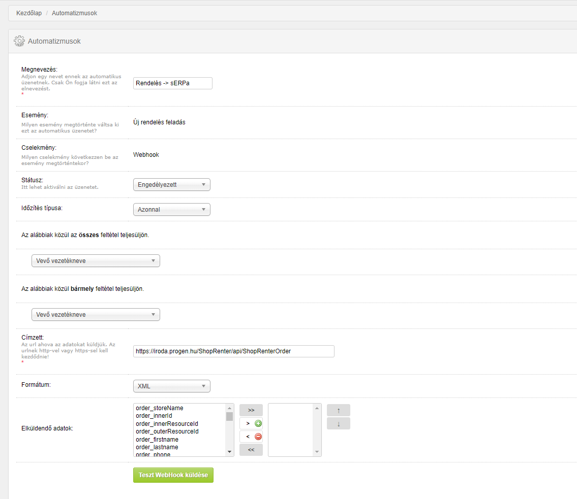 A ShopRenter admin felületén Marketing/Automatizmusok alatt találjuk meg a létrehozott WebHook-ot.