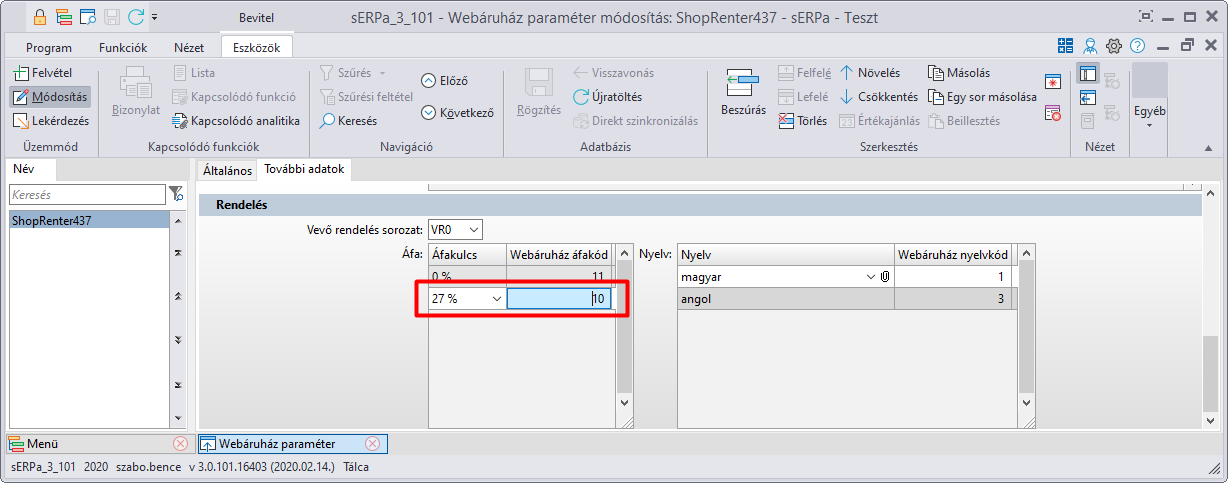 amelyet a sERPa webáruház paraméterben megadni(További adatok fül – Áfa grid).