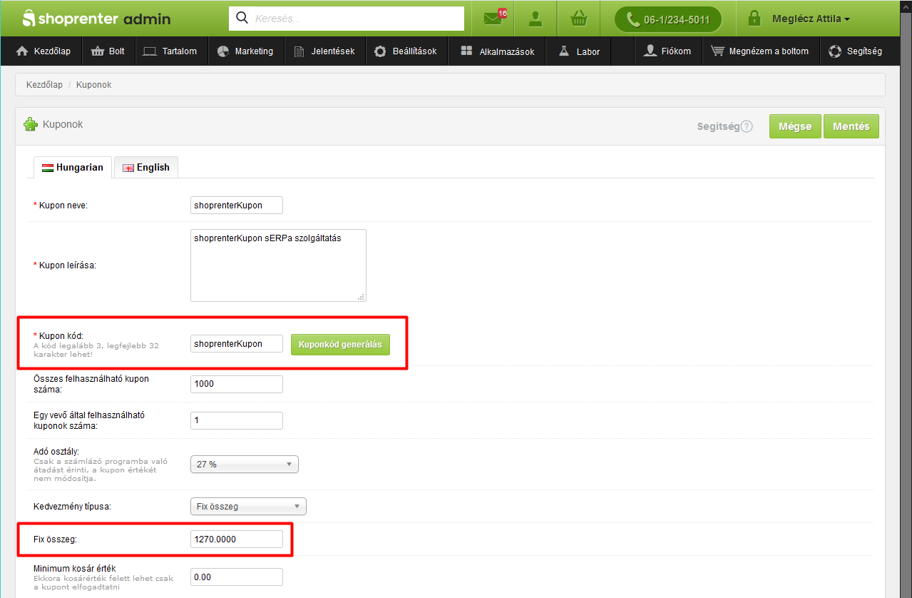 oA kupon ára minden esetben a <couponGrossPrice>-1270</couponGrossPrice> mezőből kerül ki, ezt a visszaszámoljuk 27%-os áfával, mert számlázáskor a kupon mezőjének értékét, így a példa szerinti 1270 Ft bekerül a rendelésbe 1000 Ft ként, de számlázáskor bruttósítva felkerül az 1270 Ft helyesen.