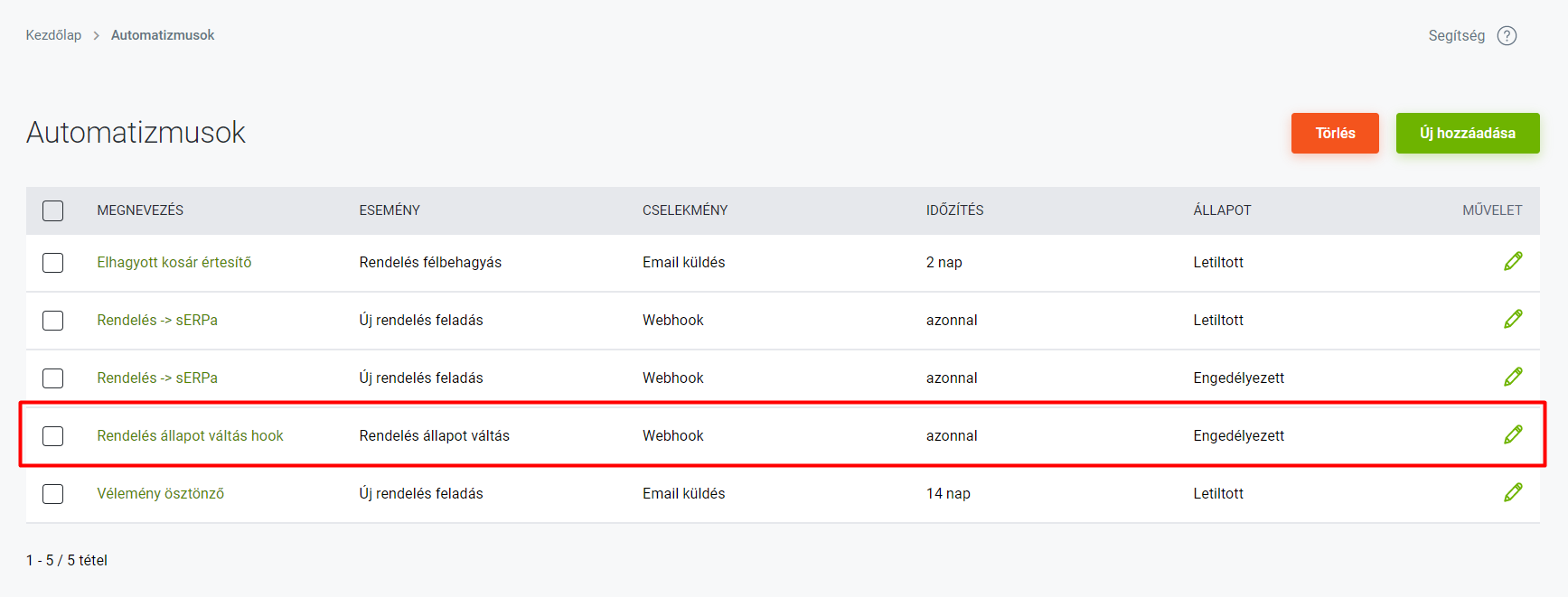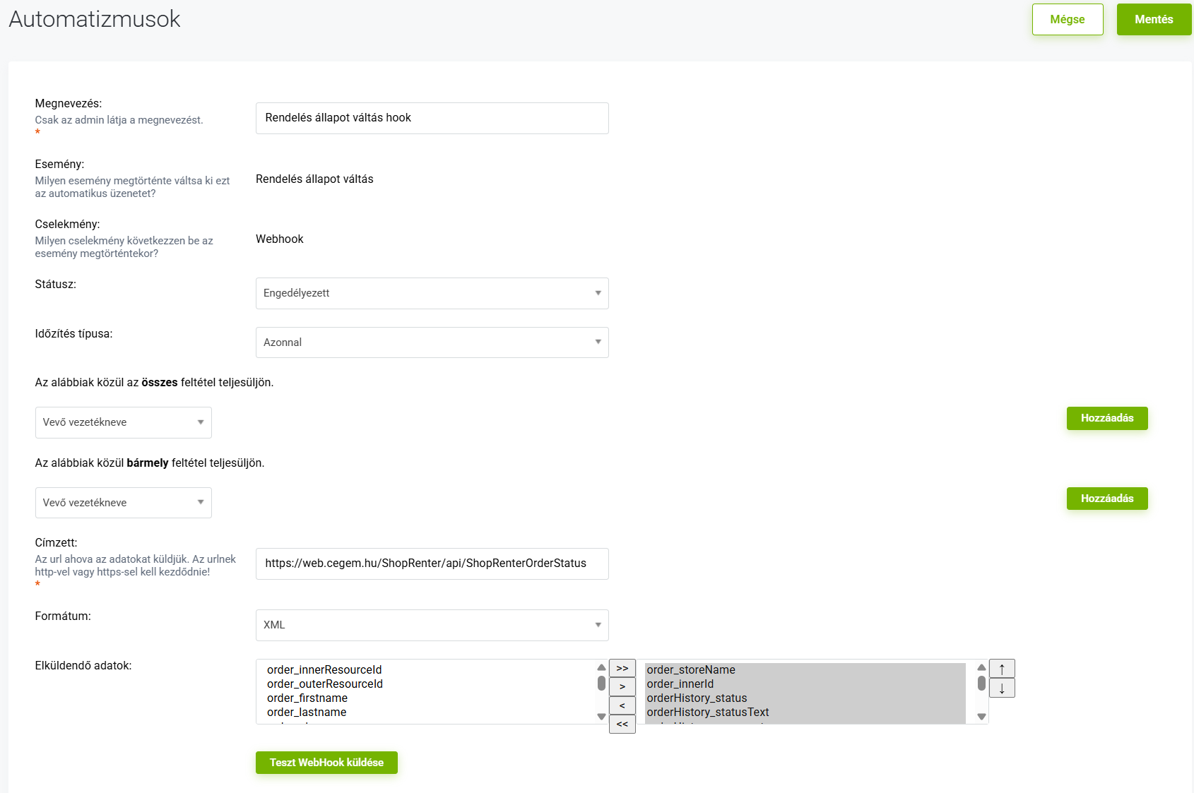 •Létre kell hozni egy Rendelés állapot váltás webhookot: