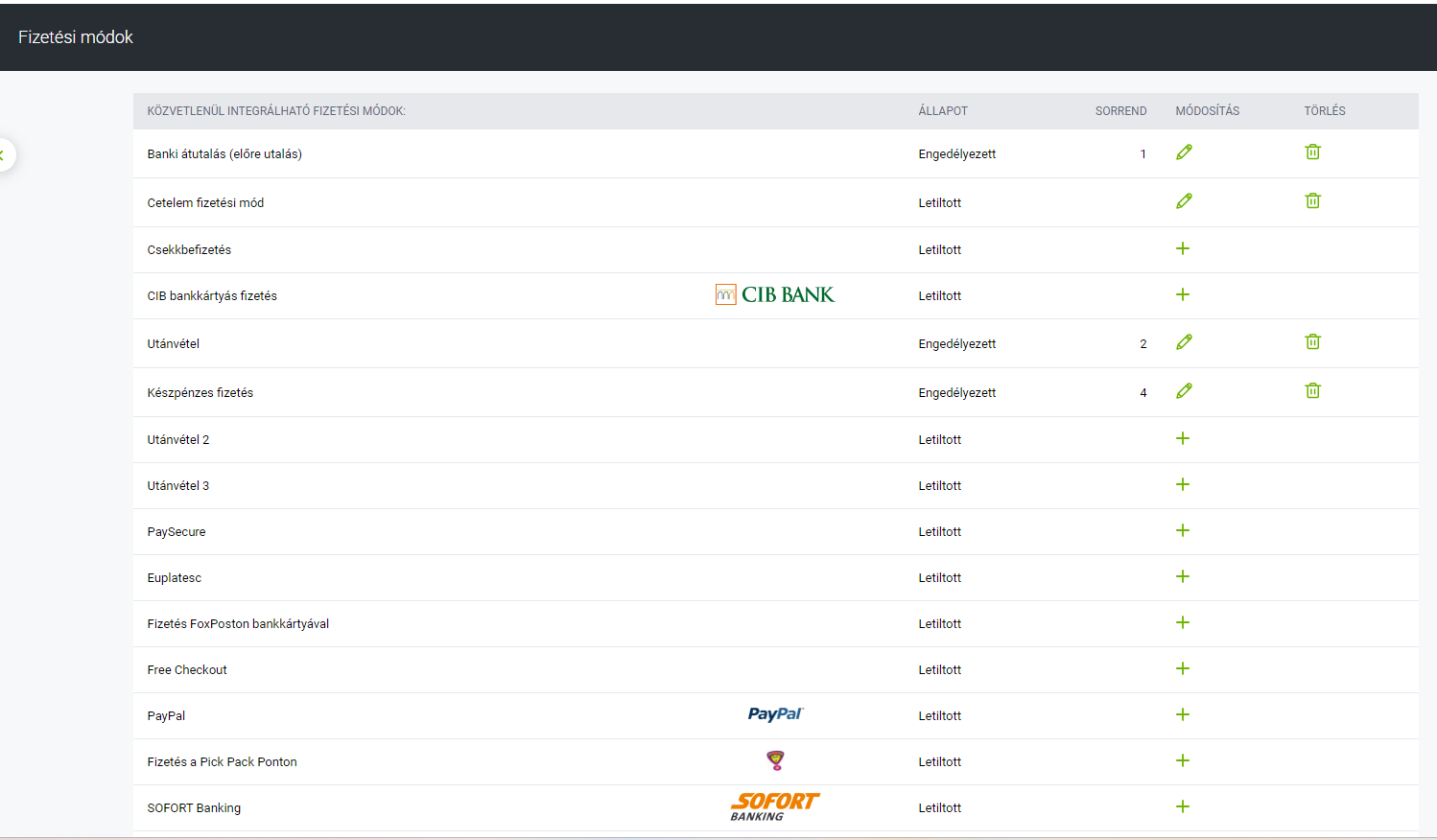 Beállítható egy fizetési mód Pl. Utánvétel. Az utánvételt szintén ebben a táblázatban tudjuk véglegesíteni. Először a termék funkcióban kell felvenni egy új szolgáltatást Utánvétel néven, majd ebben a mezőben kiválasztani a fizetési módot és a létrehozott utánvétel nevű szolgáltatást. A táblázat oszlopai: |